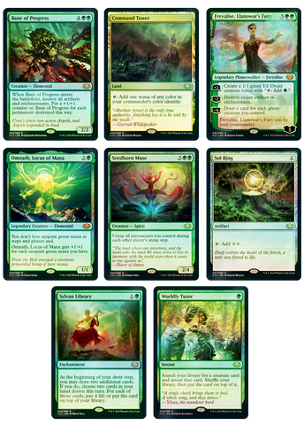 • Bane of Progress (foil) • Command Tower (foil) • Freyalise, Llanowar's Fury (foil) • Omnath, Locus of Mana (foil) • Seedborn Muse (foil) • Sol Ring (foil) • Sylvan Library (foil) • Worldly Tutor (foil)