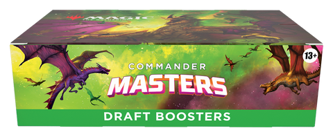 The Commander Masters Draft Booster Box contains 24 Commander Masters Draft Boosters. Each Draft Booster contains 20 cards and 1 double-sided token, including 2–4 cards of rarity Rare or higher (3: 36%; 4: 3%), 5–7 Uncommon, and 11–12 Common cards. Traditional Foil Borderless Mythic in <1% of boosters.