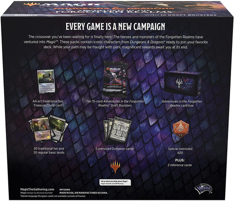 • 10 Adventures in the Forgotten Realms (AFR) Magic: The Gathering Draft Boosters • 1 foil alt-art promo card—Treasure Chest • 3 oversized dungeon cards • 40 basic land cards (20 foil + 20 nonfoil) • Oversized d20 and MTG card storage box • Beloved Dungeons & Dragons heroes and monsters have ventured into Magic for the ultimate crossover!
