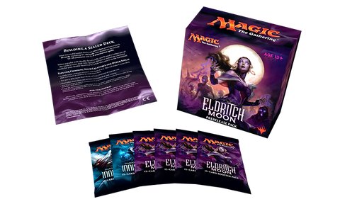 • 4 Eldritch Moon Booster Packs • 2 Shadows over Innistrad Booster Packs • 1 Foil stamped premium card (Which could be any rare or mythic rare in the set!) • 1 Premium foil, double-faced Zombie token • 1 Strategy Insert guide • 1 Spindown life counter