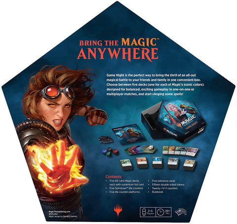 Game Night is the perfect way to bring the thrill of an all-out magical battle to your friends and family in one convenient box. Choose between five decks (one for each of Magic's iconic colors) designed for balanced, exciting gameplay in one-on-one or multiplayer matches, and start slinging some spells!