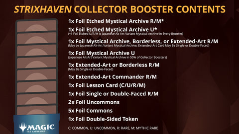 • 1x Foil Etched Mystical Archive Rary or Mythic Rare 1x Foil Etched Mystical Archive Uncommon (1 Foil Etched Uncommon, Rare, or Mythic Rare is Japanese Alt-Art Variant Mystical Archive in Every Booster) 1x Foil Mystical Archive, Borderless, or Extended-Art Rare or Mythic Rare (May be Japanese Alt-Art Variant Mystical Archive; Extended-Art Card may be Single or Double-Faced) 1x Foil Mystical Archive Uncommon (Japanese Alt-Art Variant Mystical Archive in 50% of Collector Boosters) 1x Extended-Art or Borderless Rare or Mythic Rare (May be Single or Doubled-Faced) 1x Extended-Art Commander Rare or Mythic Rare 1x Foil Lesson Card (Common, Uncommon, Rare, or Mythic Rare) 1x Foil Single or Double-Faced Rare or Mythic Rare 2x Foil Uncommons 5x Foil Commons 1x Foil Double-Sided Token